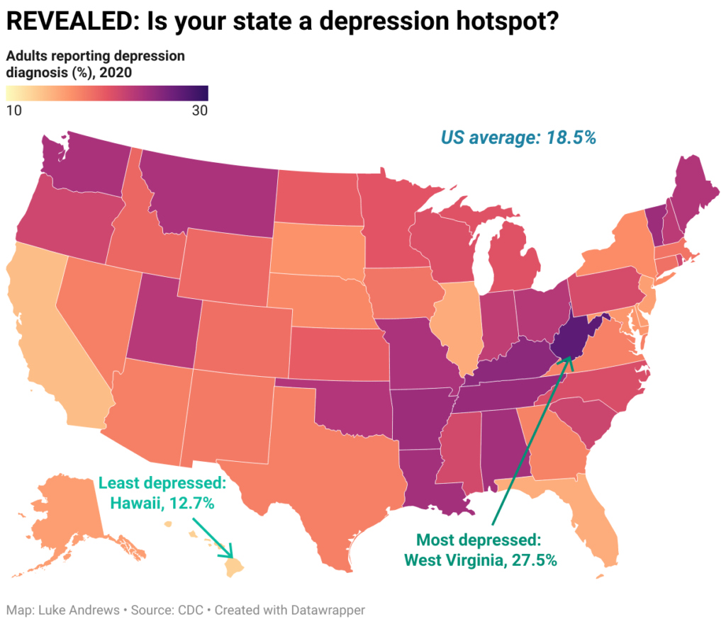 A new report from the Centers for Disease Control (CDC) analyzed results from the 2020 Behavioral Risk Surveillance Study and found stark differences in rates of self-reported depression across US states and counties. Hawaii had the lowest rate of self-reported lifetime depression at 12.7%, while West Virginia’s was more than double at 27.5%.